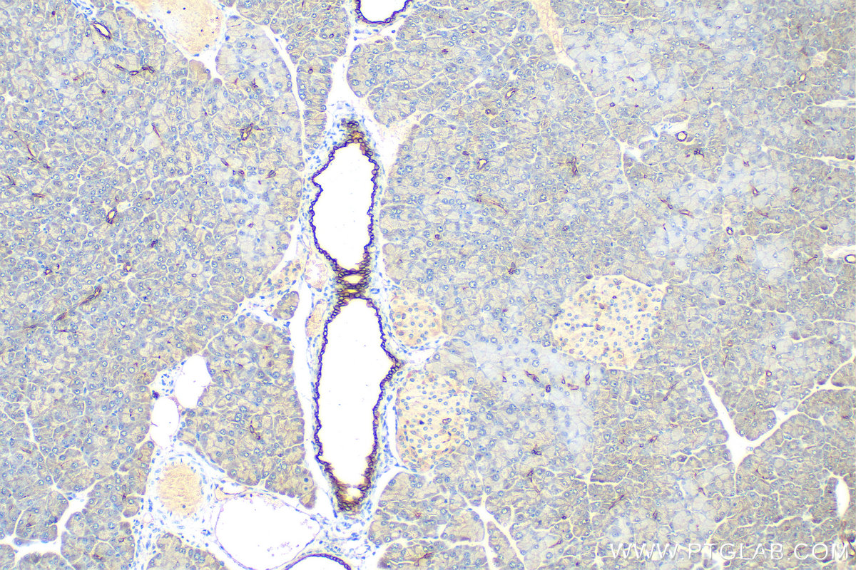 Immunohistochemical analysis of paraffin-embedded mouse pancreas tissue slide using 10712-1-AP (Cytokeratin 19 antibody) at dilution of 1:1000 (under 10x lens). Heat mediated antigen retrieval with Tris-EDTA buffer (pH 9.0).