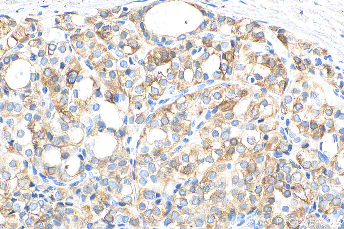 Immunohistochemical analysis of paraffin-embedded human thyroid cancer tissue slide using 10712-1-AP (Cytokeratin 19 antibody) at dilution of 1:10000 (under 40x lens). Heat mediated antigen retrieval with Tris-EDTA buffer (pH 9.0).