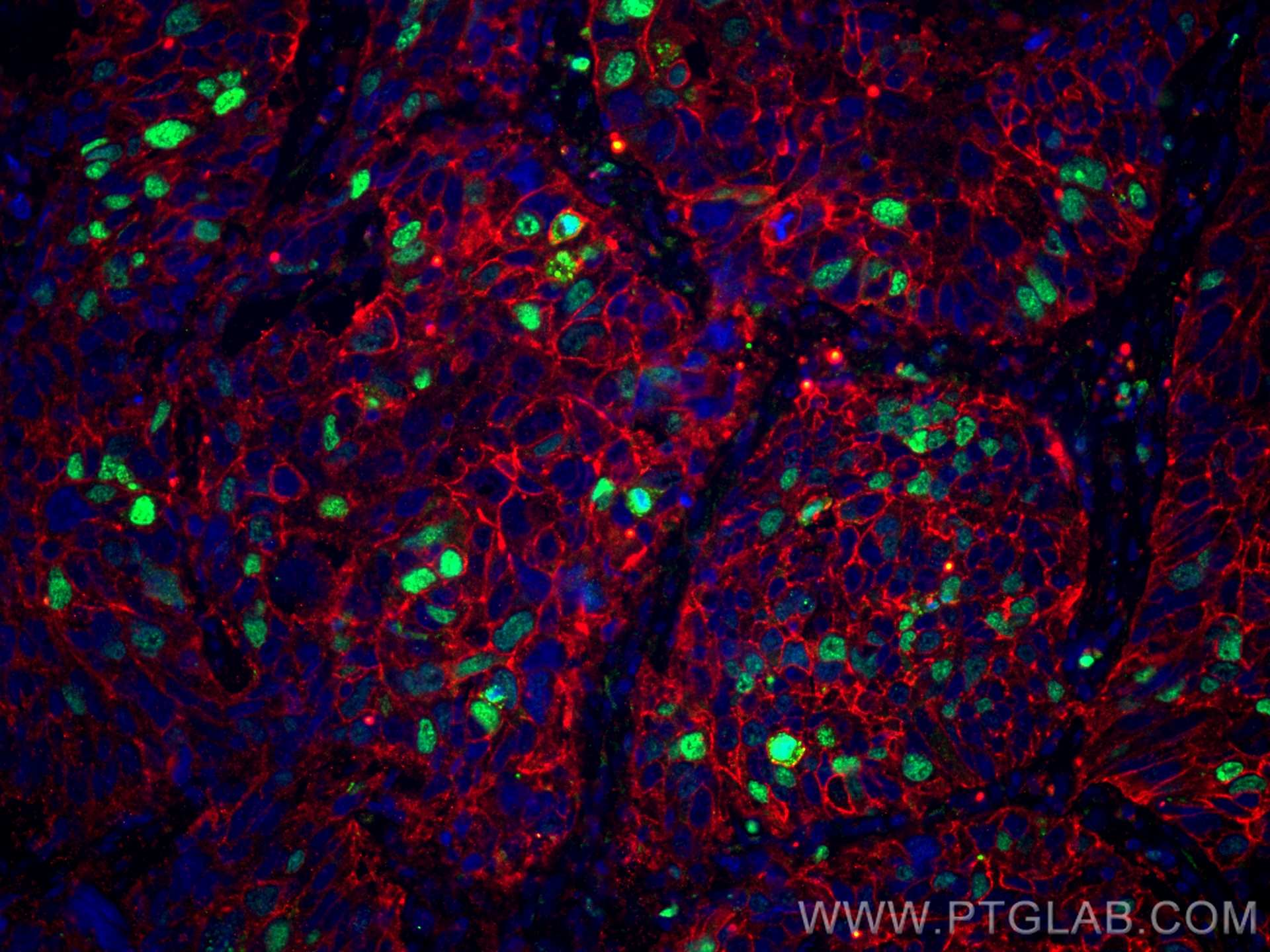 Immunofluorescent analysis of (4% PFA) fixed paraffin-embedded human lung cancer tissue using Ki-67 antibody (84192-4-RR, Clone: 241499E7 ) at dilution of 1:200 and Multi-rAb CoraLite ® Plus 488-Goat Anti-Rabbit Recombinant Secondary Antibody (H+L) (RGAR002). Heat mediated antigen retrieval with Tris-EDTA buffer (pH 9.0). This data was developed using the same antibody clone with 84192-4-PBS in a different storage buffer formulation.