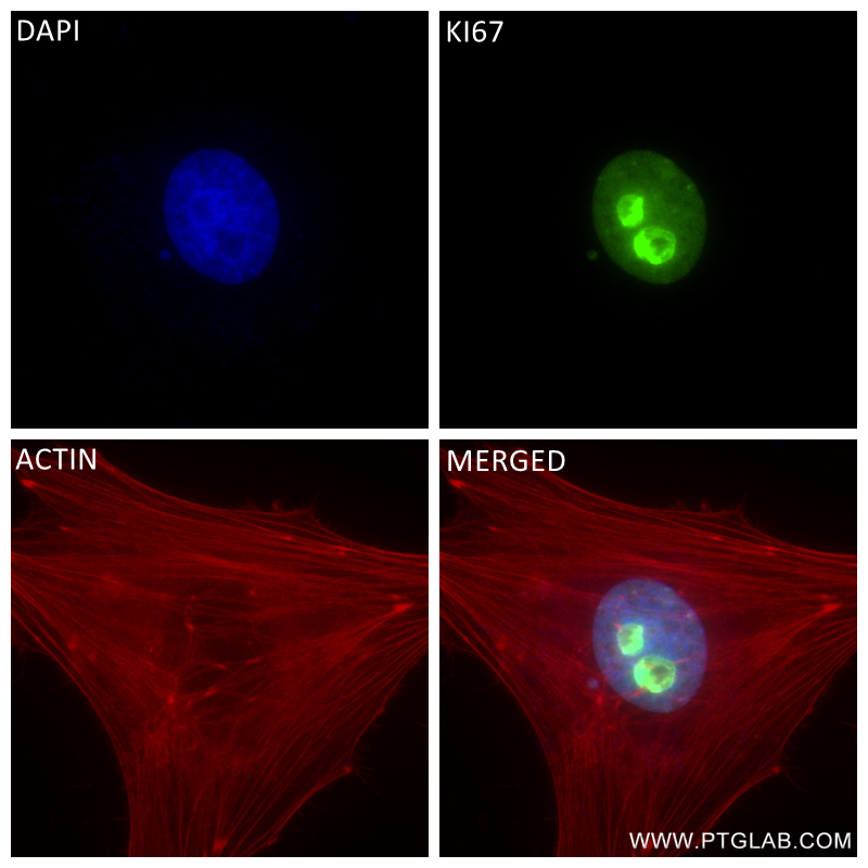 Immunofluorescent analysis of (4% PFA) fixed U2OS cells using Ki-67 antibody (84192-4-RR, Clone: 241499E7 ) at dilution of 1:400 and CoraLite®488-Conjugated Goat Anti-Rabbit IgG(H+L) (SA00013-2), CL594-Phalloidin (red) (Cat No. PF00003). This data was developed using the same antibody clone with 84192-4-PBS in a different storage buffer formulation.
