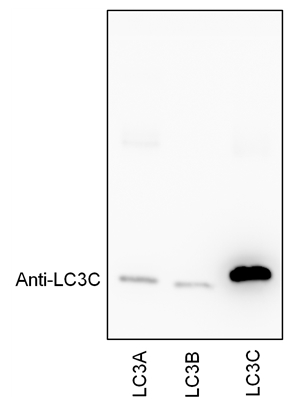 LC3C, also named as MAP1LC3C, belongs to the MAP1 LC3 family. It is the human homolog of yeast Atg8 and is involved in the formation of autophagosomal vacuoles, called autophagosomes. LC3C is produced by the proteolytic cleavage after the conserved C-terminal Gly residue. The antibody is specific to the prepeptide of LC3C.