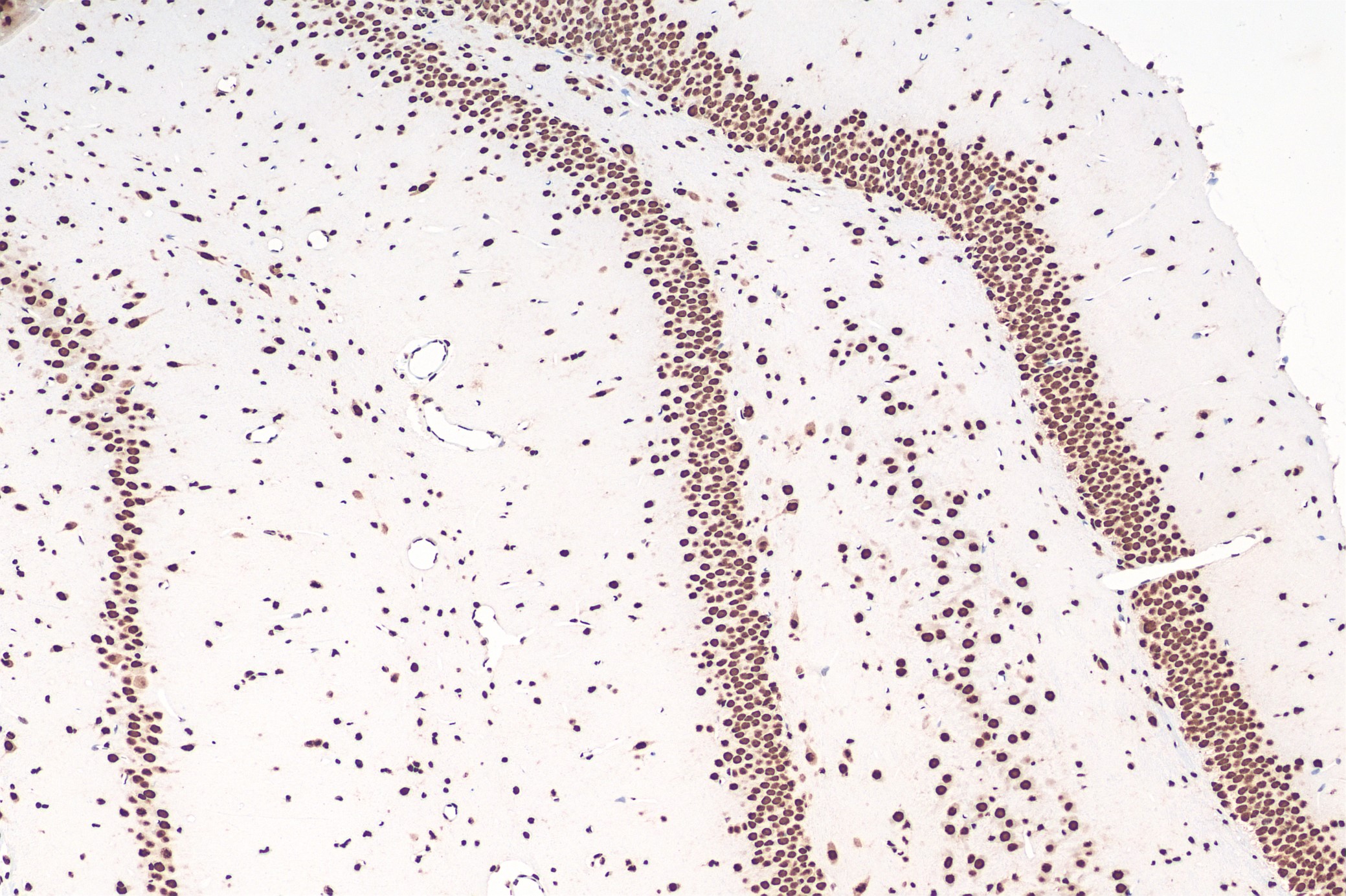 Immunohistochemical analysis of paraffin-embedded mouse brain tissue slide using 80001-1-RR (TDP-43 antibody) at dilution of 1:4000 (under 10x lens). Heat mediated antigen retrieval with Tris-EDTA buffer (pH 9.0). Multi-rAb™ Polymer HRP-Goat anti-rabbit Recombinant secondary antibody RGAR011 was used for detection. The staining was performed on Celnovte's CNT360-M1 autostainer.