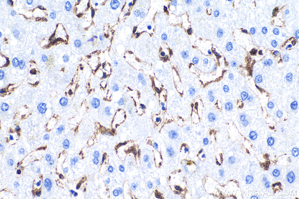 Immunohistochemical analysis of paraffin-embedded mouse liver tissue slide using 81668-1-RR (F4/80 antibody) at dilution of 1:5000 (under 10x lens). Heat mediated antigen retrieval with Tris-EDTA buffer (pH 9.0). Multi-rAb™ Polymer HRP-Goat anti-rabbit Recombinant secondary antibody RGAR011 was used for detection. The staining was performed on Celnovte's CNT360-M1 autostainer.