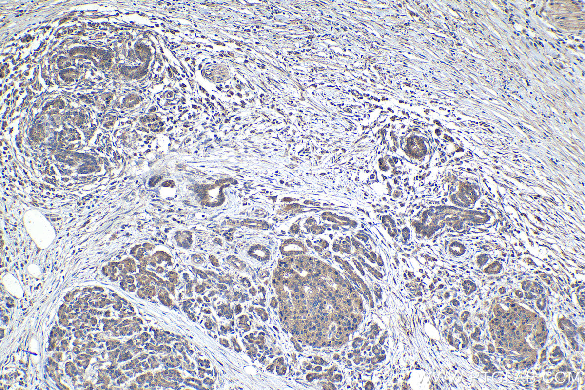 Immunohistochemical analysis of paraffin-embedded human pancreas cancer tissue slide using 21146-1-AP (LARS antibody) at dilution of 1:1000 (under 10x lens). Heat mediated antigen retrieval with Tris-EDTA buffer (pH 9.0). Multi-rAb™ Polymer HRP-Goat anti-rabbit Recombinant secondary antibody RGAR011 was used for detection.