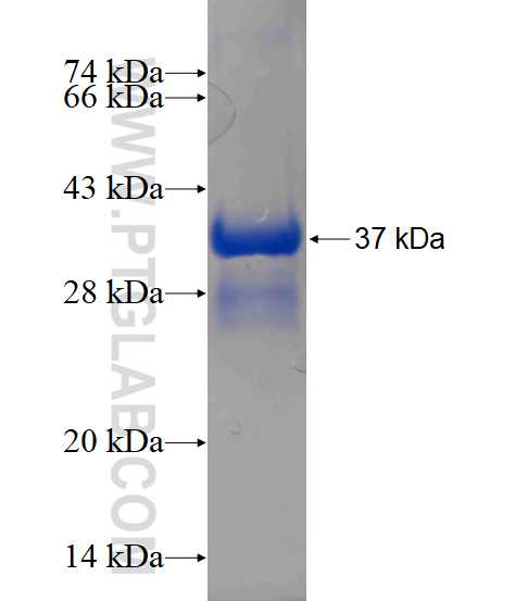 | Formulation | The purified protein was Lyophilized from sterile PBS (58mM Na2HPO4,17mM NaH2PO4, 68mM NaCl, pH8.0). 5 % trehalose and 5 % mannitol are added as protectant before lyophilization. The elution buffer contain 100mM GSH. |