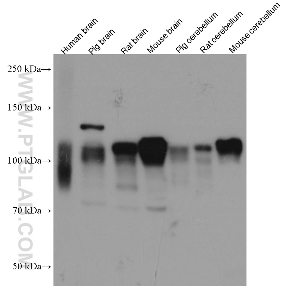 | Positive WB detected in | mouse brain tissue, rat brain tissue, rabbit brain tissue, pig brain tissue, human brain tissue, pig cerebellum tissue, rat cerebellum tissue, mouse cerebellum tissue |
