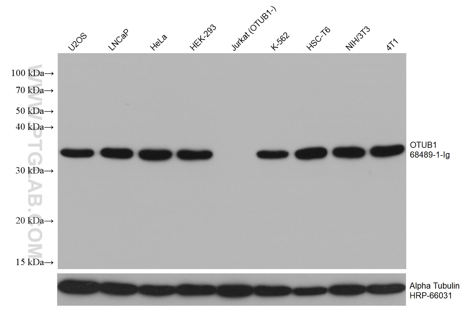 68489-1-Ig targets OTUB1 in WB, IF/ICC, ELISA applications and shows reactivity with human, mouse, rat samples.