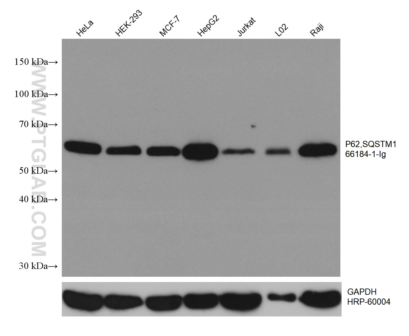 66184-1-Ig targets P62/SQSTM1 in WB, IHC, IF/ICC, IP, CoIP, ELISA applications and shows reactivity with human samples.