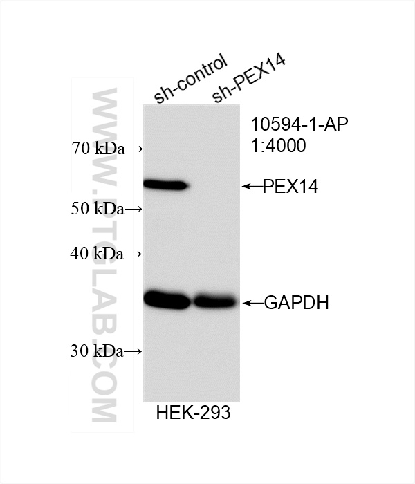 10594-1-AP targets PEX14 in WB, IHC, IF/ICC, FC (Intra), IP, ELISA applications and shows reactivity with human, mouse, rat, monkey samples.