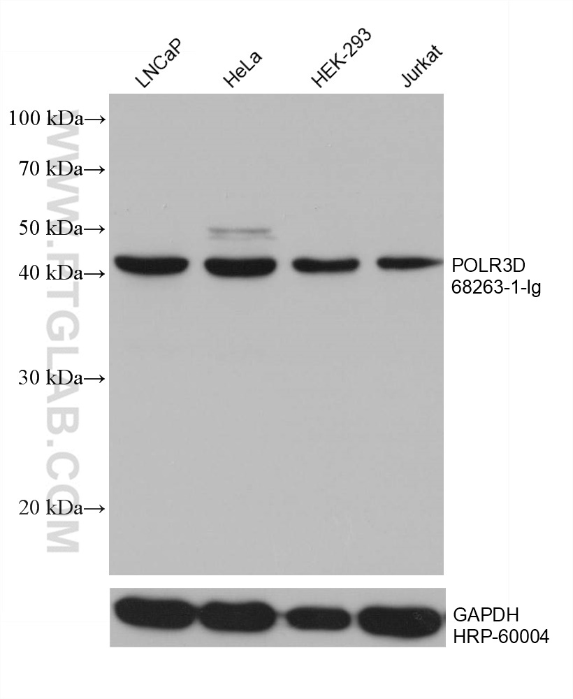 68263-1-PBS targets POLR3D in Indirect ELISA, WB applications and shows reactivity with rabbit, human samples.