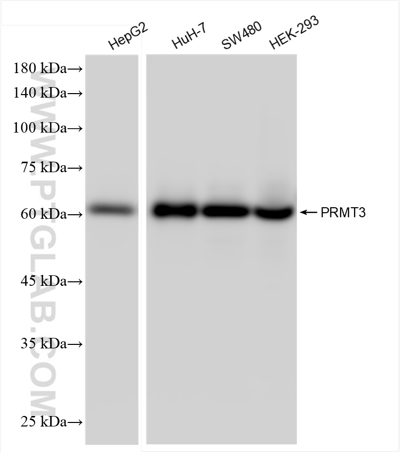 83969-7-PBS targets PRMT3 in WB, IF/ICC, FC (Intra), ELISA applications and shows reactivity with human samples.