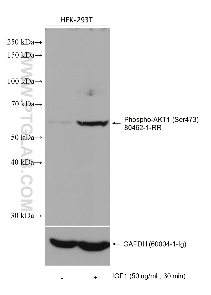 AKT is a serine/threonine kinase and it participates in the key role of the PI3K signaling pathway. Phosphatidylinositol-3 kinase (PI3K) is the key regulator of AKT activation. The recruitment of inactive AKT protein to PIP3-rich areas of the plasma membrane results in a conformational change that exposes the activation loop of AKT. AKT's activating kinase, phosphoinositide-dependent protein kinase (PDK1) , is also recruited to PIP3 microdomains. PDK1 phosphorylates AKT on threonine 308 (Thr308) of the exposed activation loop, activating AKT and leading to a second phosphorylation of AKT at serine 473 (Ser473) by a kinase presumed to be mTORC2 that further potentiates kinase activity. Active AKT will phosphorylate various downstream protein targets that control cell growth and translational control and act to suppress apoptosis. (PMID: 31594388, PMID: 30808672). 80462-1-RR specifically recognizes AKT1 phosphorylated at Ser473.