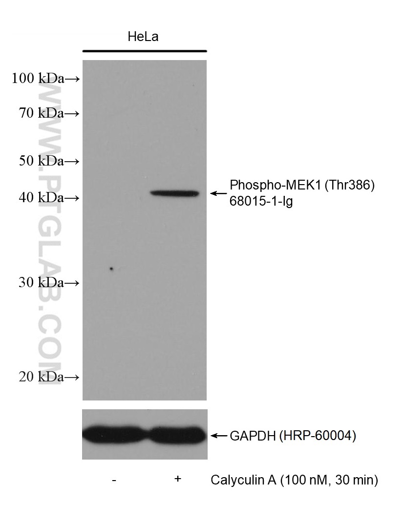 68015-1-Ig targets Phospho-MEK1 (Thr386) in WB, IF/ICC, ELISA applications and shows reactivity with human, mouse samples.