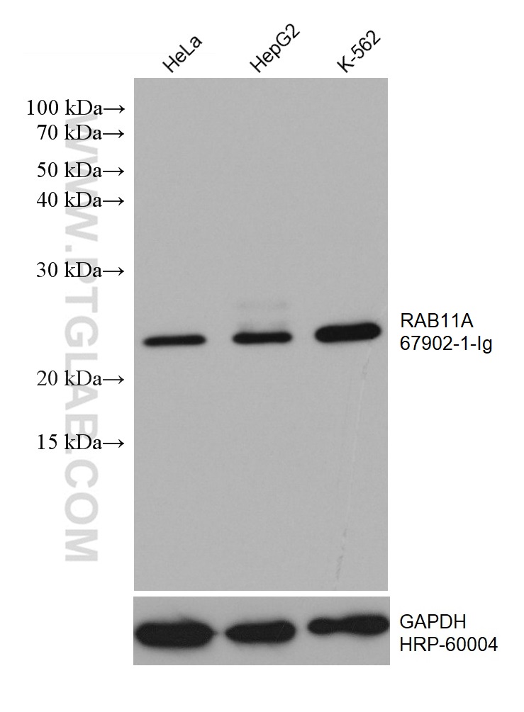 67902-1-PBS targets RAB11A in WB, IF/ICC, FC (Intra), ELISA applications and shows reactivity with human, mouse, rat, pig, rabbit samples.