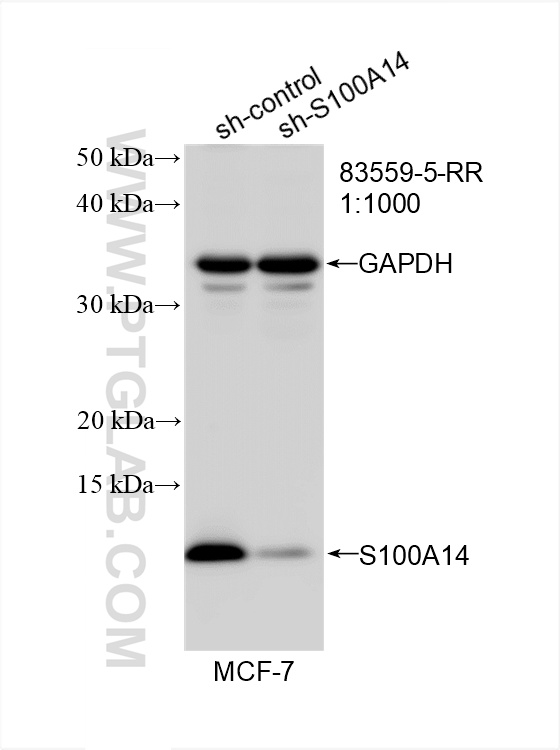 83559-5-PBS targets S100A14 in WB, IHC, FC (Intra), ELISA applications and shows reactivity with human, mouse, rat samples.