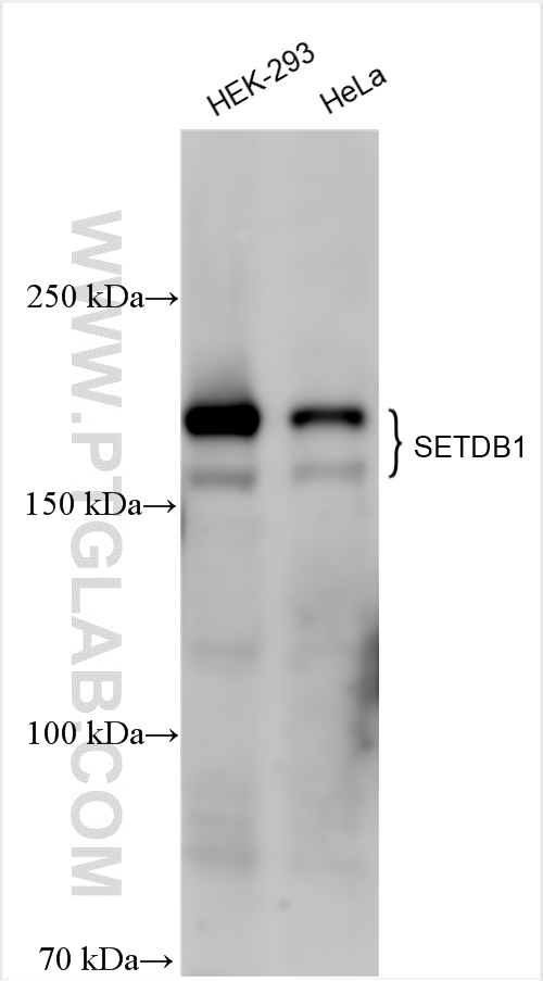 SETDB1, also named as ESET, KIAA0067 and KMT1E, belongs to the histone-lysine methyltransferase family. It is a SET domain protein with histone H3-K9-specific methyltransferase activity. H3 'Lys-9' trimethylation is coordinated with DNA methylation and represents a specific tag for epigenetic transcriptional repression by recruiting HP1 (CBX1, CBX3 and/or CBX5) proteins to methylated histones. SETDB1 mainly functions in euchromatin regions, thereby playing a central role in the silencing of euchromatic genes. It probably forms a complex with MBD1 and ATF7IP that represses transcription and couples DNA methylation and histone 'Lys-9' trimethylation. Its activity is dependent on MBD1 and is heritably maintained through DNA replication by being recruited by CAF-1. SETDB1 regulates histone methylation, gene silencing, and transcriptional repression. It has been identified as a target for treatment in Huntington Disease, given that gene silencing and transcription dysfunction likely play a role in the disease pathogenesis. This antibody is a rabbit polyclonal antibody raised against residues near the N terminus of human SETDB1.The calculated molecular weight of SETDB1 is 143 kDa, but the modified SETDB1 protein is about 170 kDa (PMID: 11791185).