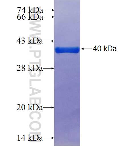 | Formulation | The purified protein was Lyophilized from sterile PBS (58mM Na2HPO4,17mM NaH2PO4, 68mM NaCl, pH8.0). 5 % trehalose and 5 % mannitol are added as protectant before lyophilization. The elution buffer contain 100mM GSH. |
