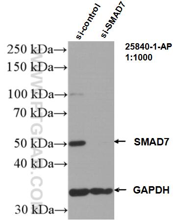 25840-1-AP targets SMAD7 in WB, IHC, IF, IP, CoIP, ELISA applications and shows reactivity with human, mouse samples.