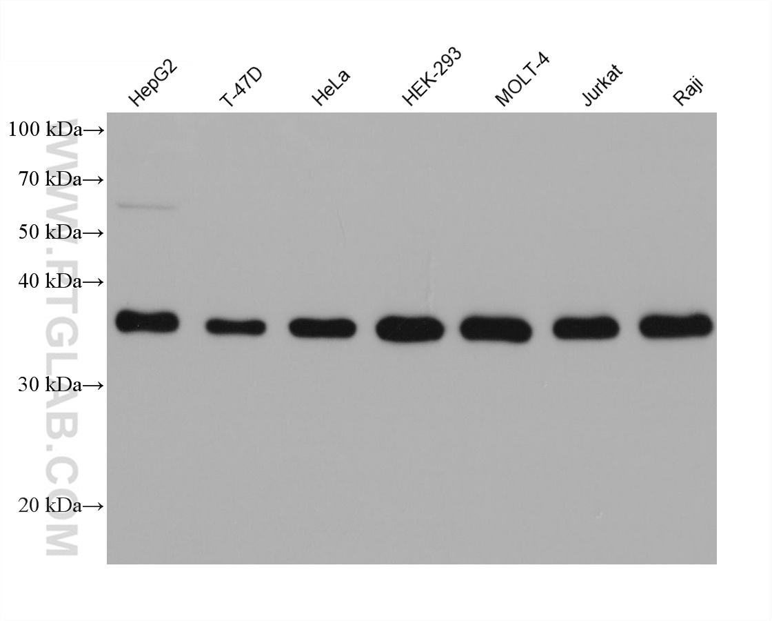 | Positive WB detected in | HepG2 cells, A375 cells, HeLa cells, T-47D cells, HEK-293 cells, MOLT-4 cells, Jurkat cells, Raji cells |