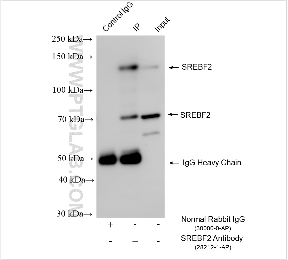28212-1-PBS targets SREBF2 in WB, IP, Indirect ELISA applications and shows reactivity with human samples.