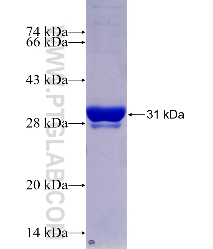 | Formulation | The purified protein was Lyophilized from sterile PBS (58mM Na2HPO4,17mM NaH2PO4, 68mM NaCl, pH8.0). 5 % trehalose and 5 % mannitol are added as protectant before lyophilization. The elution buffer contain 100mM GSH. |