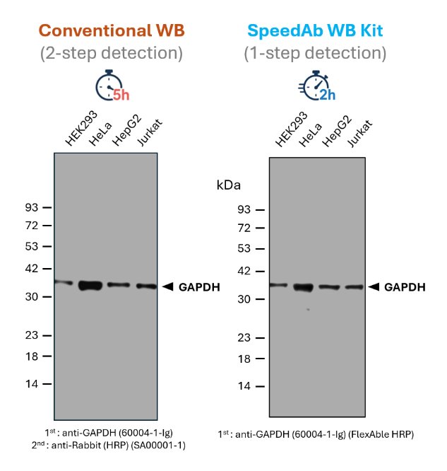SpeedAb Western Blot Kits are ideal for fast western blot workflows, cutting down protocol time of your experiment to ~2h, while also minimizing hands-on time.