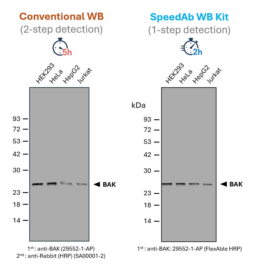 SpeedAb Western Blot Kits are ideal for fast western blot workflows, cutting down protocol time of your experiment to ~2h, while also minimizing hands-on time.