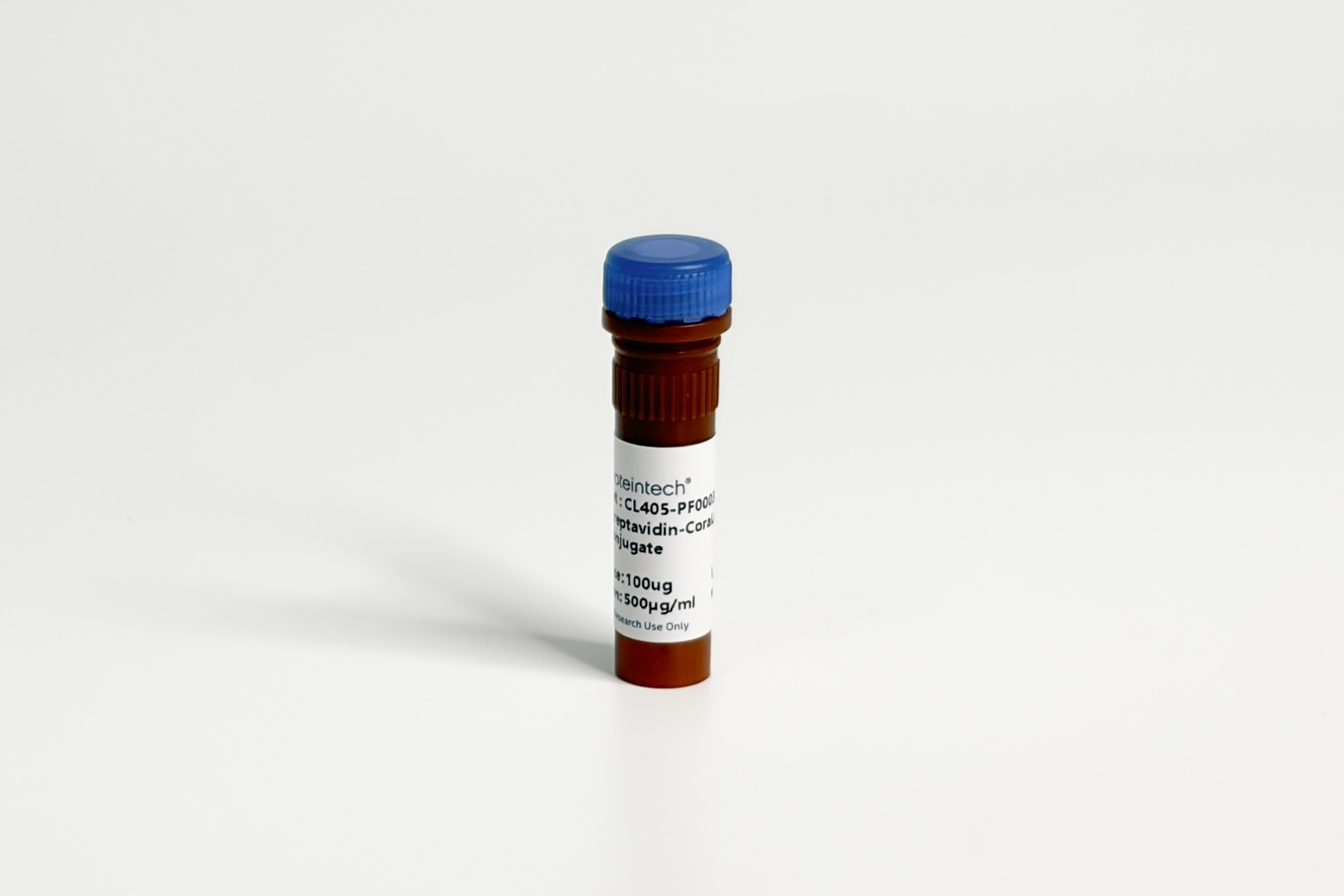 Streptavidin-CoraLite® Plus 405 Conjugate (CL405-PF00030) is a conjugate solution product of a fluorescent marker (CoraLite® Plus 405) and streptavidin. Suggested working solution concentrations or dilutions range from 1:200 to 1:1000. It can be used in conjunction with biotinylated proteins (Biotin-conjugated affinity-purified secondary antibodies of various types, or Biotin-conjugated antibodies and chromatography-grade proteins) for a variety of immunoassays.