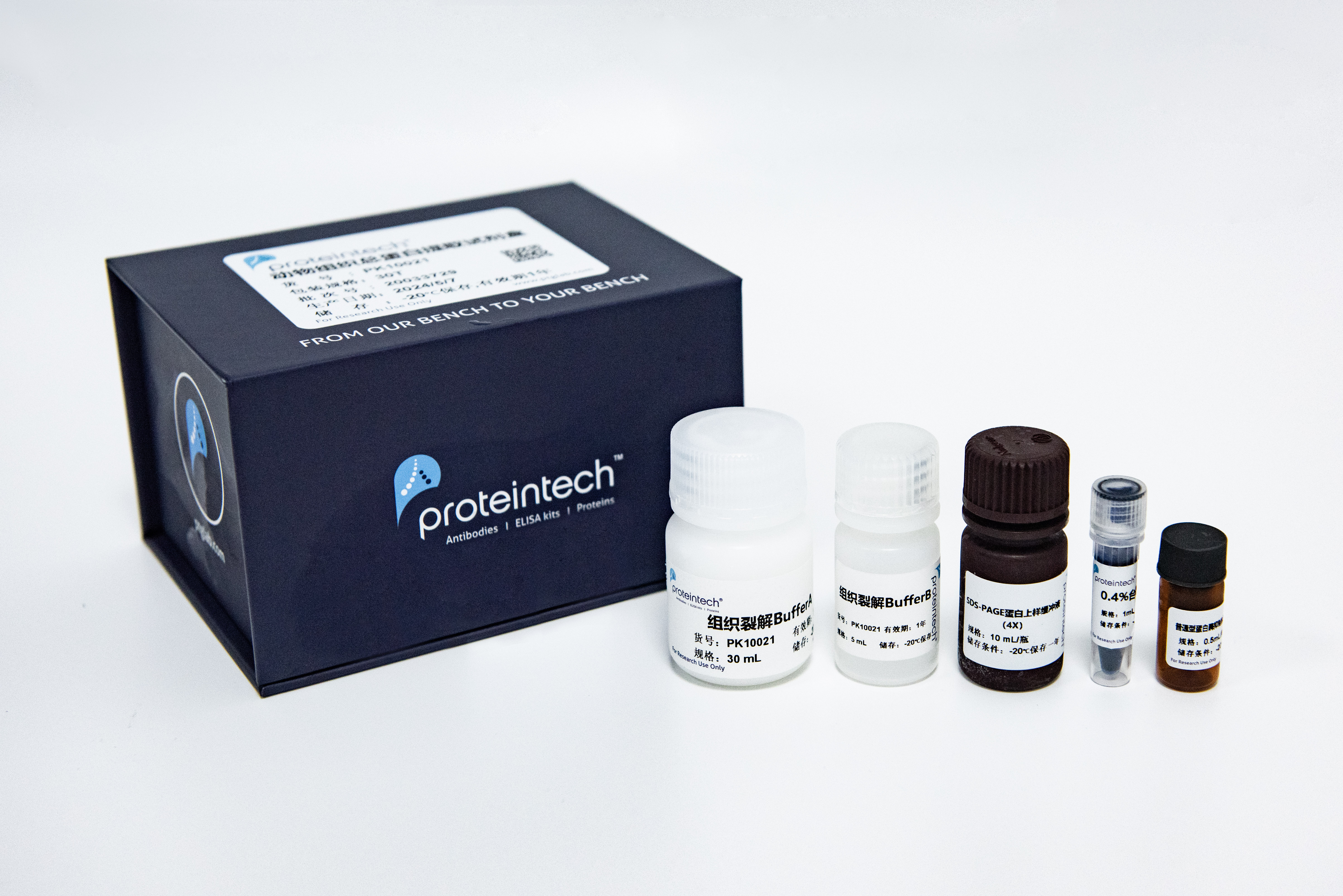 Proteintech动物组织总蛋白提取试剂盒适用于从新鲜或冻存的动物组织(无脊椎动物和脊椎动物)中提取总蛋白。此款试剂盒配有两款裂解强度的裂解液,能够高效的提取细胞总蛋白,主要包括细胞质、细胞膜、细胞核、核基质、线粒体、内质网、高尔基体等蛋白。其中,组织裂解BufferA试剂基于变性去垢剂来制备裂解液,推荐用于SDS-PAGE,免疫印迹等实验;组织裂解BufferB试剂基于非变性去垢剂来制备裂解液,与多数下游检测(包括蛋白免疫印迹、免疫沉淀、ELISA检测,蛋白质分析等)兼容。试剂盒中还含有蛋白酶抑制剂混合物,能有效阻止蛋白酶对蛋白的降解,保护目标蛋白完整性。