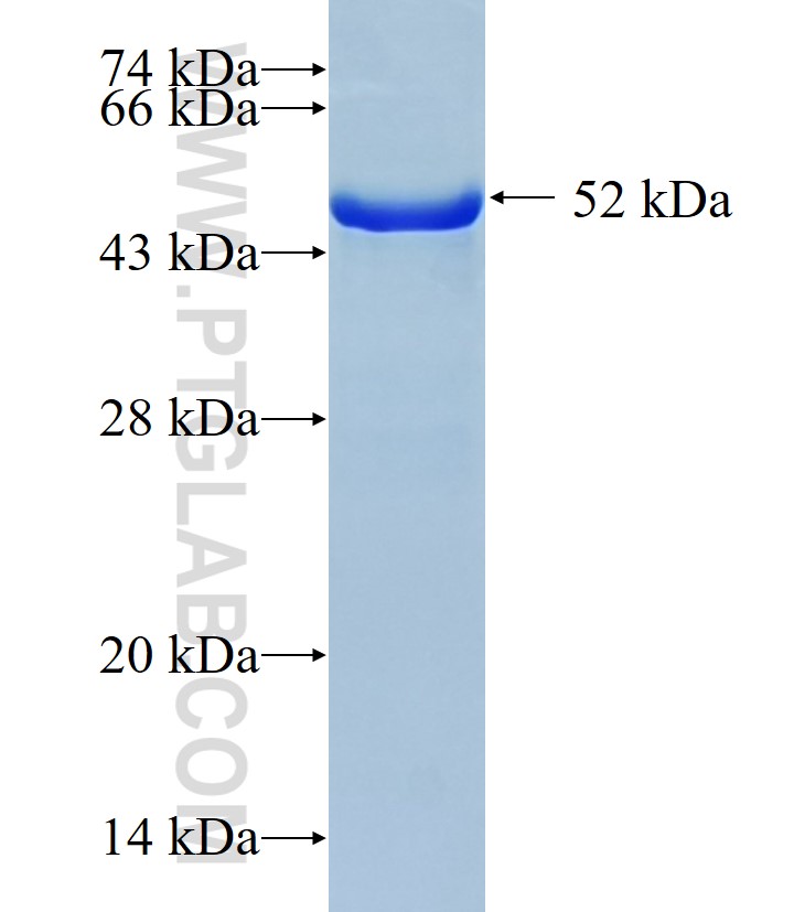 | Formulation | The purified protein was Lyophilized from sterile PBS (58mM Na2HPO4,17mM NaH2PO4, 68mM NaCl, pH8.0). 5 % trehalose and 5 % mannitol are added as protectant before lyophilization. The elution buffer contain 100mM GSH. |