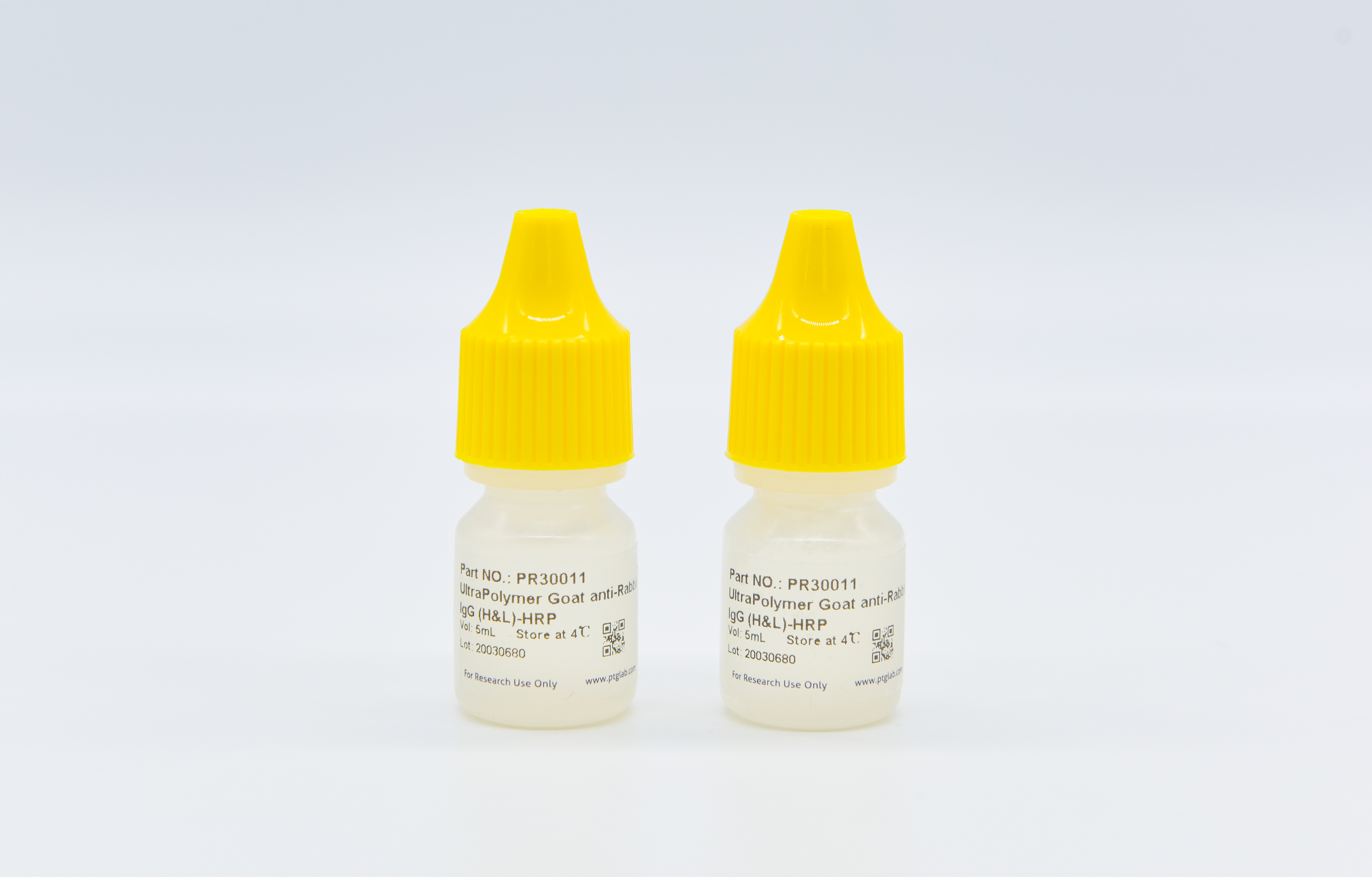 此二抗是利用最新的聚合技术将多个过氧化物酶(HRP)分子及抗兔免疫球蛋白(IgG)偶联到多聚物上,形成的聚合物(二抗)具有放大信号增加敏感度、减少非特异性背景特点。与兔一抗进行搭配使用,结合后再与DAB反应,可得棕色显色。