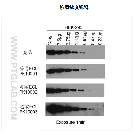 Proteintech 研发的超敏ECL 化学发光检测试剂盒(Ultrasensitive ECL Detection Kit,PK10003)是免疫印迹实验中与辣根过氧化物酶(HRP)配套使用的底物检测试剂盒。本产品能够在HRP 的催化下发生化学反应而发光,可用于检测固定在膜上的蛋白质等生物大分子,由于使用了两种新的增强剂混合协同增强发光,其高灵敏度能够检测低pg 级别的抗原,发光信号更强烈持久,使用照相技术(X-光胶片曝光)或者其他成像方法(如荧光或化学发光成像仪)进行检测。