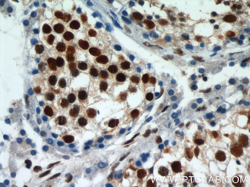 | Immunohistochemical staining of paraffin-embedded human testis using HDAC1 antibody (10197-1-AP) at a dilution of 1:50 (under 40x lens). |