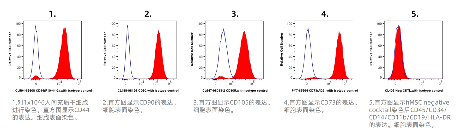 间充质干细胞(MSC)是一类存在于多种组织(如骨髓、脐带、胎盘、脂肪等),具有自我更新能力和多向分化潜力的成体干细胞。流式细胞术可根据特定表面蛋白的表达来分离、识别 MSC。人 MSC 的最小表型模式要求CD73、CD90 和 CD105 阳性,而 CD14、CD34、CD45 和 HLA-DR 阴性。