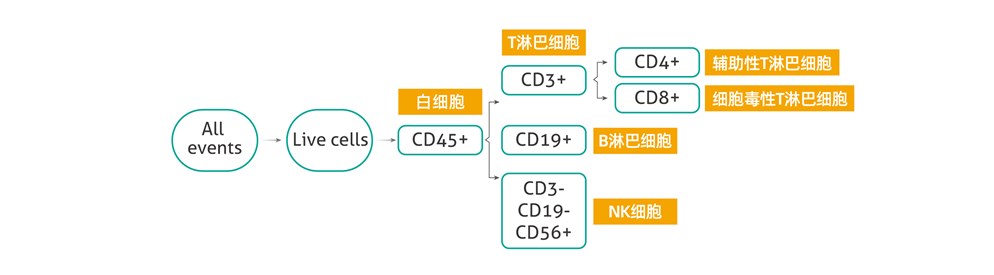 TBNK 细胞检测通常包括 T 细胞亚群分析、B 细胞亚群分析和自然杀伤细胞计数等。将淋巴细胞分为 T 淋巴细胞 (CD3+) 、B 淋巴细胞(CD19+) 和 NK 细胞(CD3-/CD19-/CD56+) ,T 淋巴细胞可进一步被分离成辅助型 T 细胞和细胞毒性 T 细胞。
