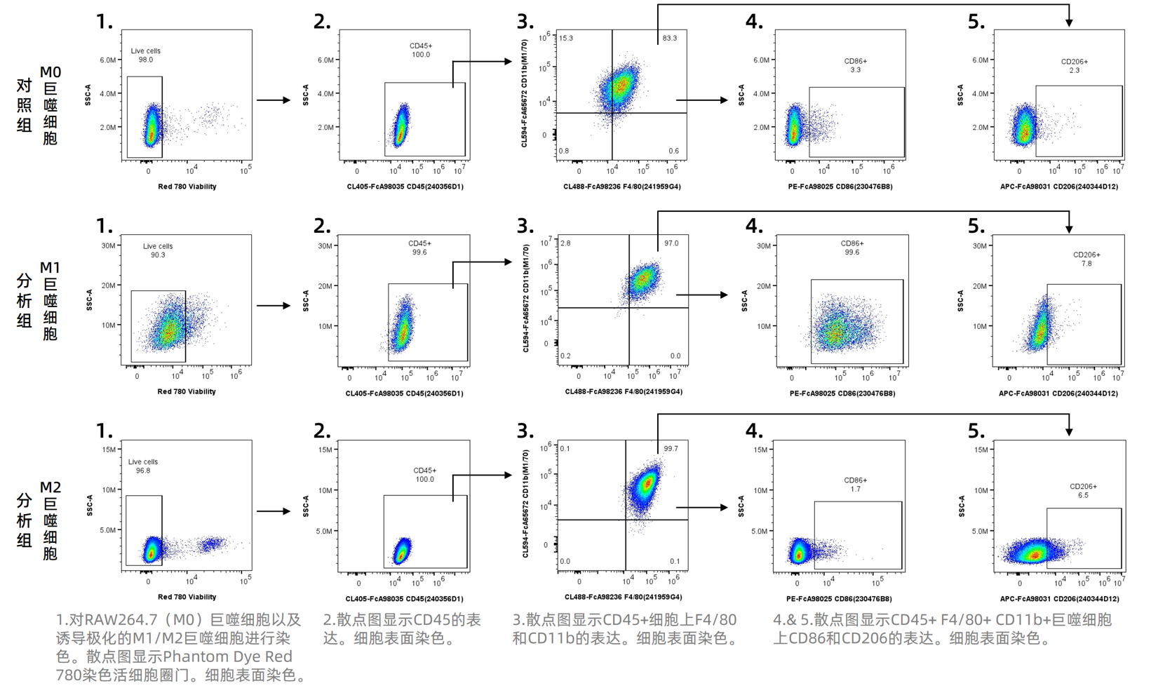 小鼠巨噬细胞基础亚群分析通过先检测RAW264.7(M0)巨噬细胞以及诱导极化的M1/M2巨噬细胞上 CD45 以及 CD11b、F4/80(小鼠巨噬细胞检测标志物)的表达确认巨噬细胞群,而后检测该群细胞上 CD86 和 CD206 的表达。