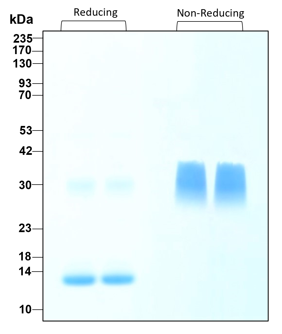 Molecular Mass 14 and 36 kDa reduced, 29 to 32 kDa non-reduced, homodimer, glycosylated