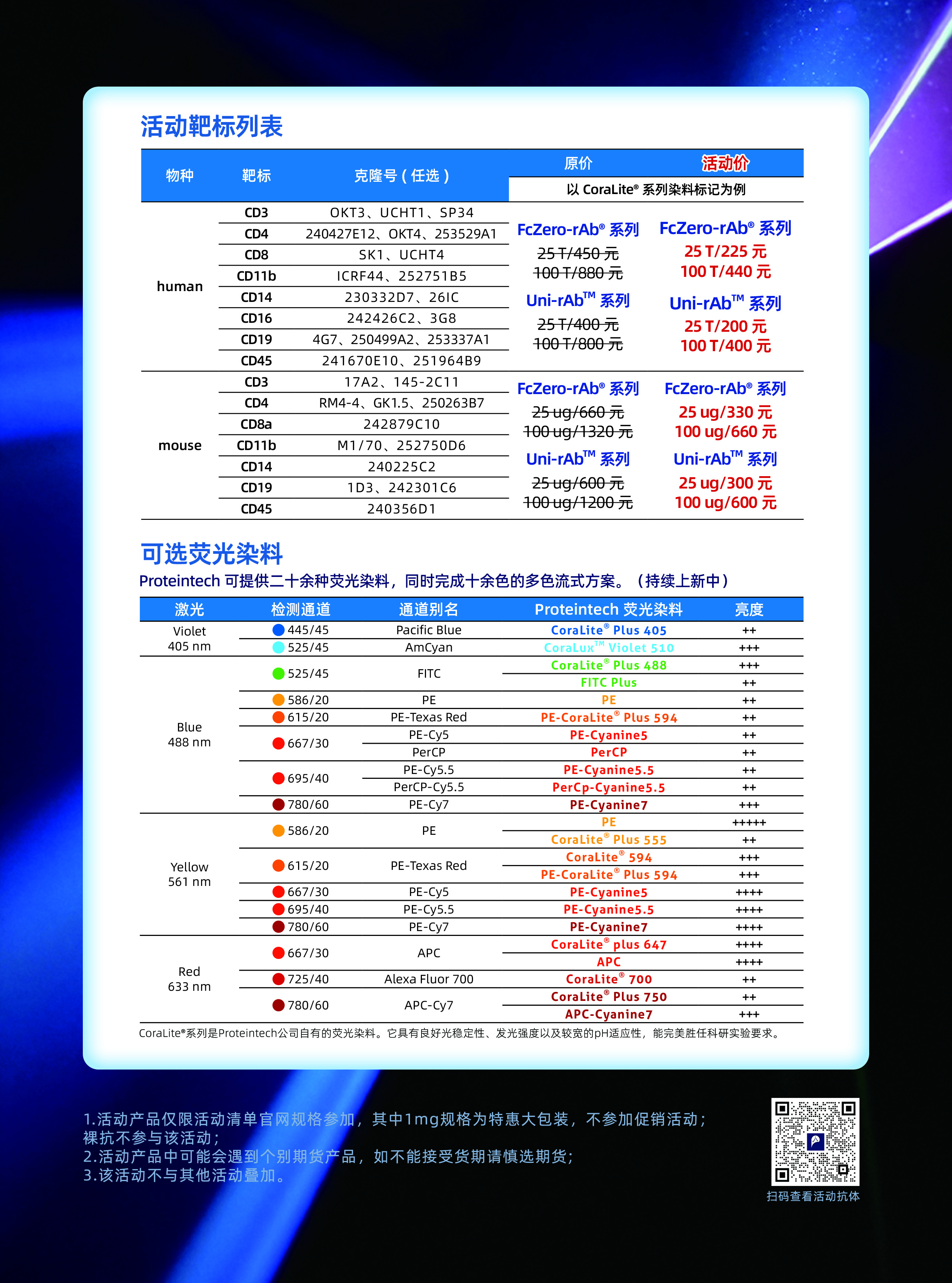 2. 可提供Biotin、FITC Plus、CoraLite® Plus 405/488/555/594/647/700/750、CoraLux Violet 510、PE、PE-Cyanine5、PE-Cyanine5.5、PE-Cyanine7、PE-CoraLite® Plus 594、APC、APC-Cyanine7、PerCP、PerCP-Cyanine5.5等20余种可选标记物,如果表格中没有找到所需靶标的所需染料标记,可联系右侧客服定制;
