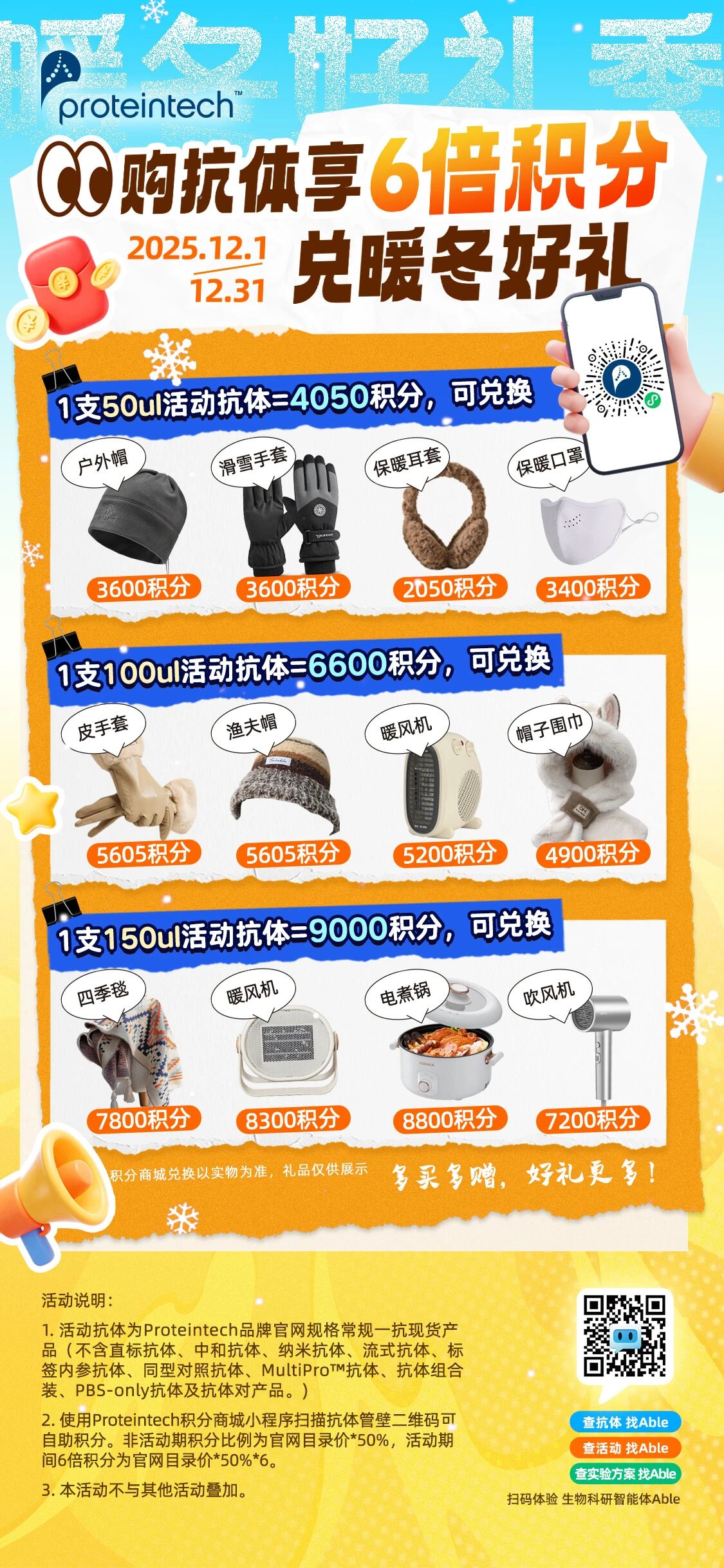 2.使用Proteintech积分商城小程序扫描抗体管壁二维码可自助积分。非活动期积分比例为官网目录价*50%,活动期间6倍积分为官网目录价*50%*6