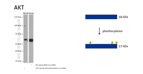 Figure 5: The serine/threonine-protein kinase AKT plays a role in many cellular processes. Survival factors can suppress apoptosis in a transcription-independent manner by activating the serine/threonine kinase AKT1, which then phosphorylates and inactivates components of the apoptotic machinery. (60203-2-Ig detects all the AKT members with or without phosphorylation, 66444-1-Ig detects the phospho-Ser473 of AKT1 and phospho-S474 of AKT2/phospho-Ser472 of AKT3.)